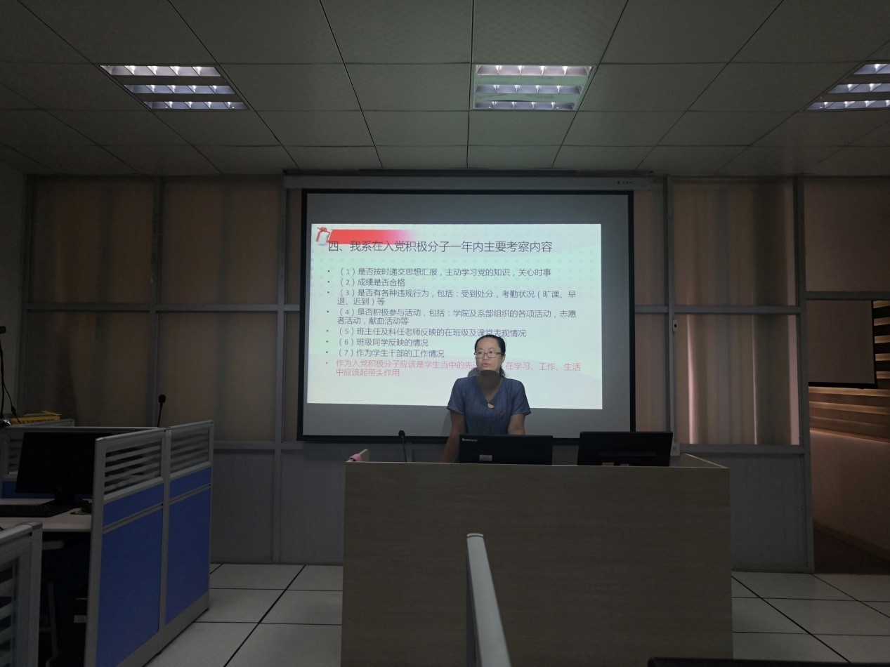 为进一步端正入党积极分子的入党动机,商务系第一支部书记蔡丹丹于6月26日上午在东教210为我系入党积极分子进行入党积极分子党课教育学习。