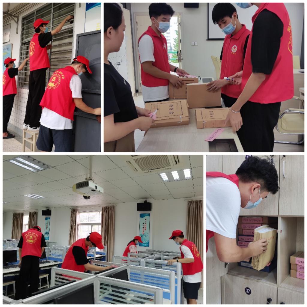 9月21日上午,商务系党员教师以及学生志愿者一同整理档案资料并且打扫清洁东教二楼机房、楼层走廊、楼梯、扶手等公共区域。