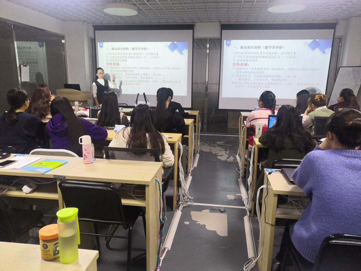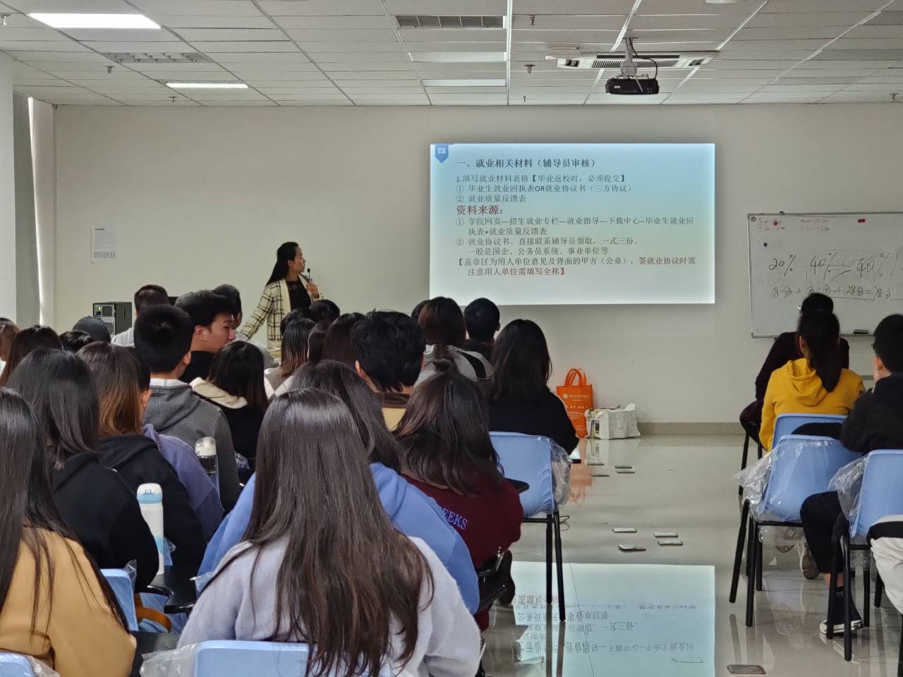 李丽悉老师以离校程序单为例讲解了毕业资质,介绍毕业手续办理程序,以及毕业生返校一周的安排;还介绍了关于学生个人档案和组织关系的去向安排;最后强调了未来半年里主要时间节点和需要注意的事项。