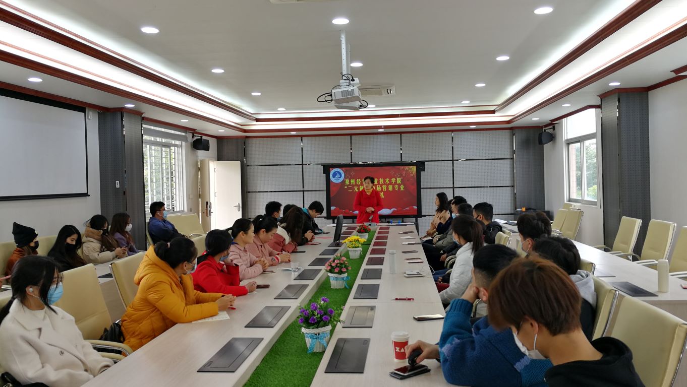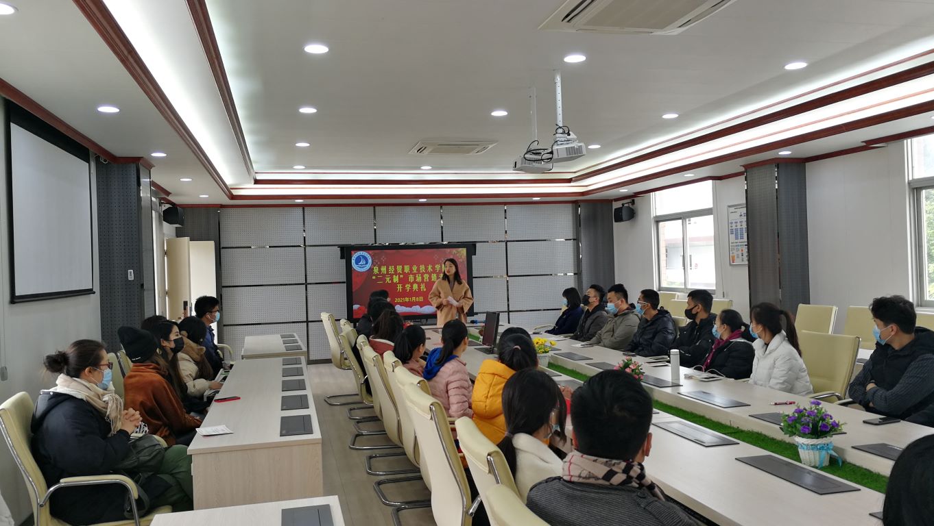 1月8日,我院与泉州菁荟信息技术股份有限公司校企联合办学“二元制”市场营销专业20级开班仪式在商务系东310会议室举行。商务系副主任潘茹,泉州菁荟信息技术股份有限公司总经理黄梅,学院网络电教中心办公室主任吴田力,商务系有关人员及“二元制”市场营销专业20级全体学生出席开班仪式。