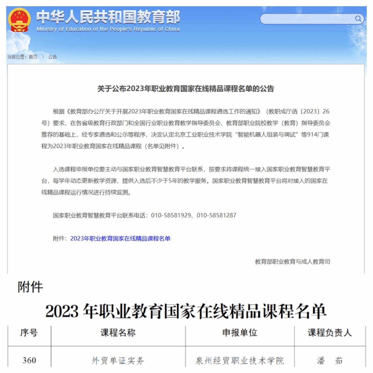 职业教育国家在线精品课程是职业教育领域的标杆与典范,代表了我国职教领域课程建设的最高水平,评选标准极其严格。本次全国范围内共有388所高职院校(含25所职业本科与363所高职专科院校)的914门课程入选2023年职业教育国家在线精品课程。