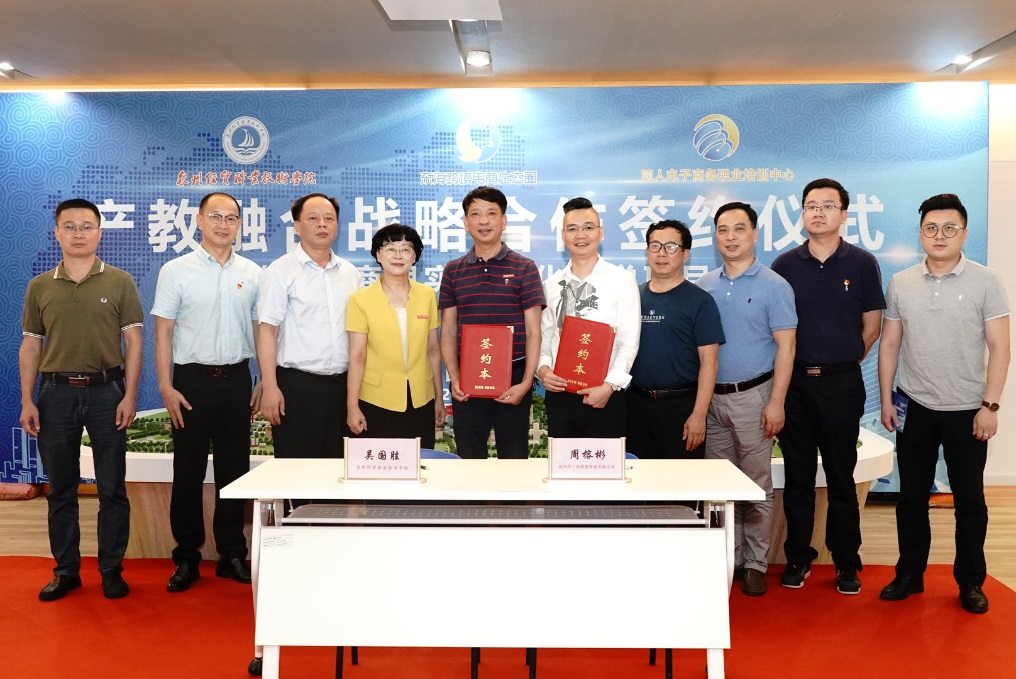 6月24日下午,泉州经贸职业技术学院与泉州市三保教育咨询有限公司(泉州东海跨境电商生态圈、丰泽区同人电子商务职业培训中心)在东海跨境电商圈举行“产教融合战略合作”签约仪式。泉州市丰泽区政府副区长曾国家、区发改局副局长施庆松、区人社局副局长薛建、区经贸综合行政执法大队大队长陈俊伟、区东海街道宣传委员陈培养、泉州市跨境电子商务协会副会长叶宏坚;校方代表泉州经贸职业技术学院党委书记周文心、党委委员、副院长赖东升、商务系主任吴国胜、副主任潘茹、综合办主任蔡丹丹。企业方代表领秀天地广告产业园运营有限公司负责人罗辉、泉州市三保教育咨询有限公司总经理周榕彬出席仪式,30余名跨境电商企业代表共同参会。