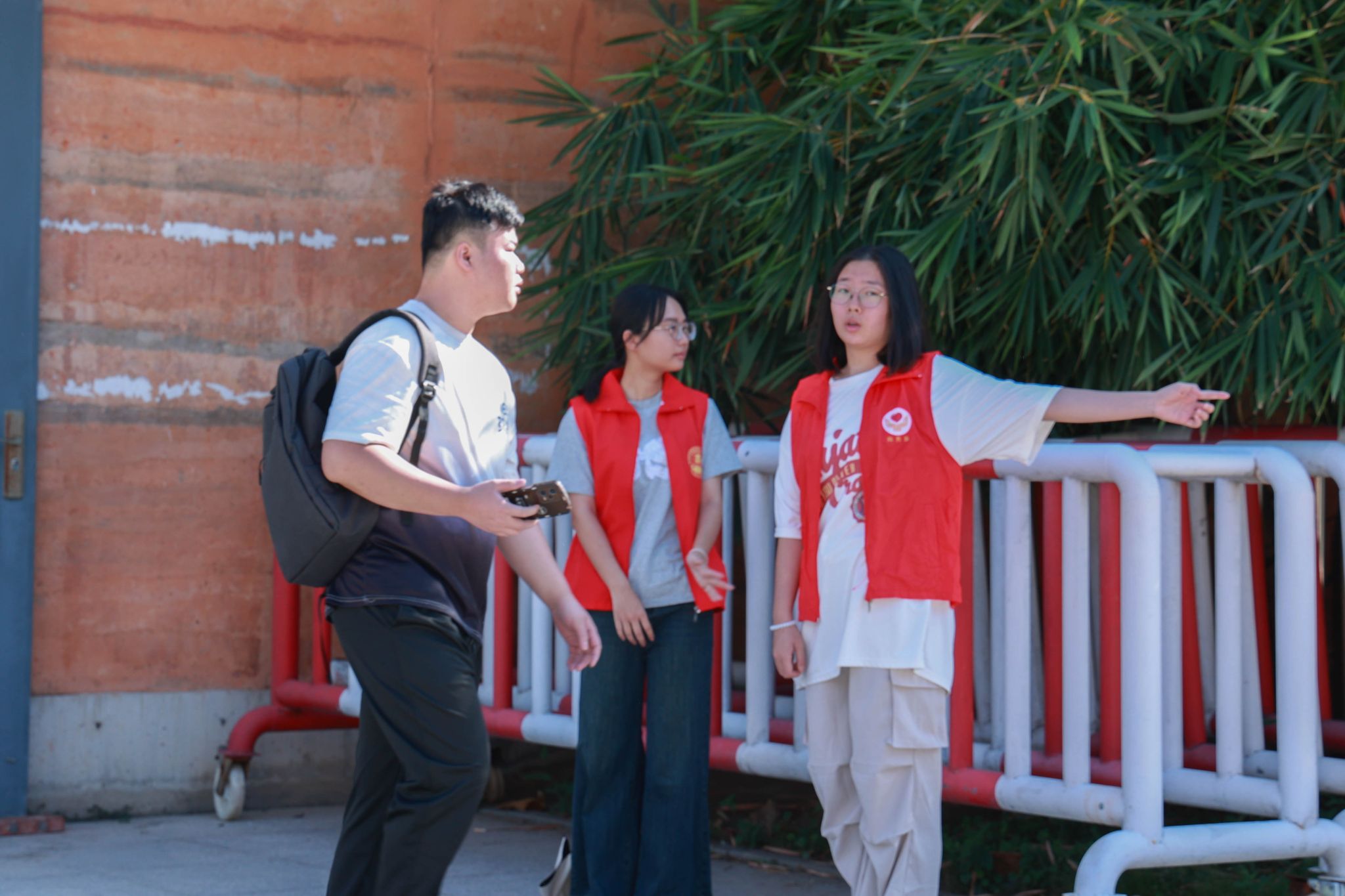 典礼现场,商务系志愿者们身着志愿服,引导退役军人新生前往会场。另一部分志愿者在会场内分工合作,收集新生材料并维持秩序。展现了学院师生团结协作、热情服务的良好风貌。