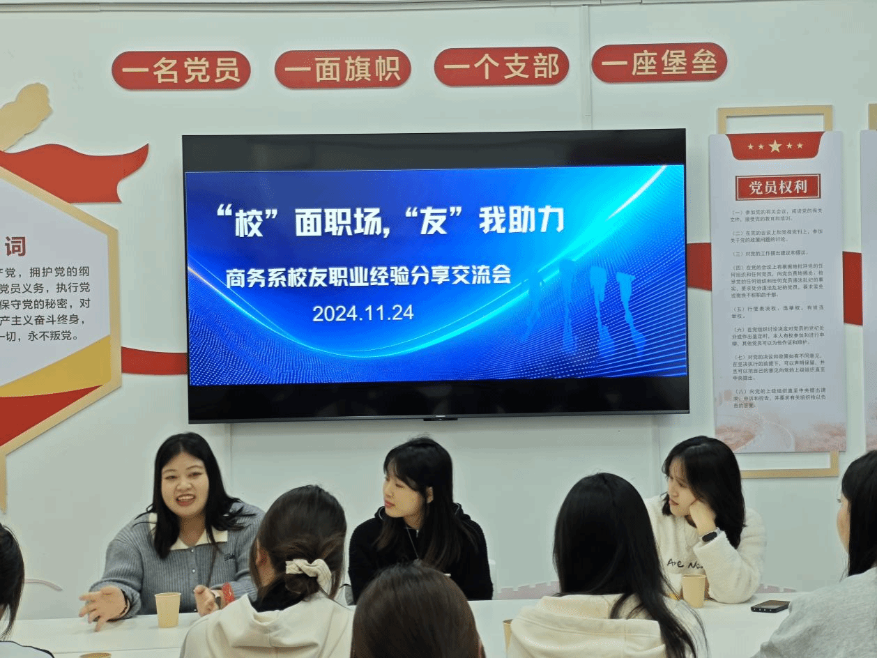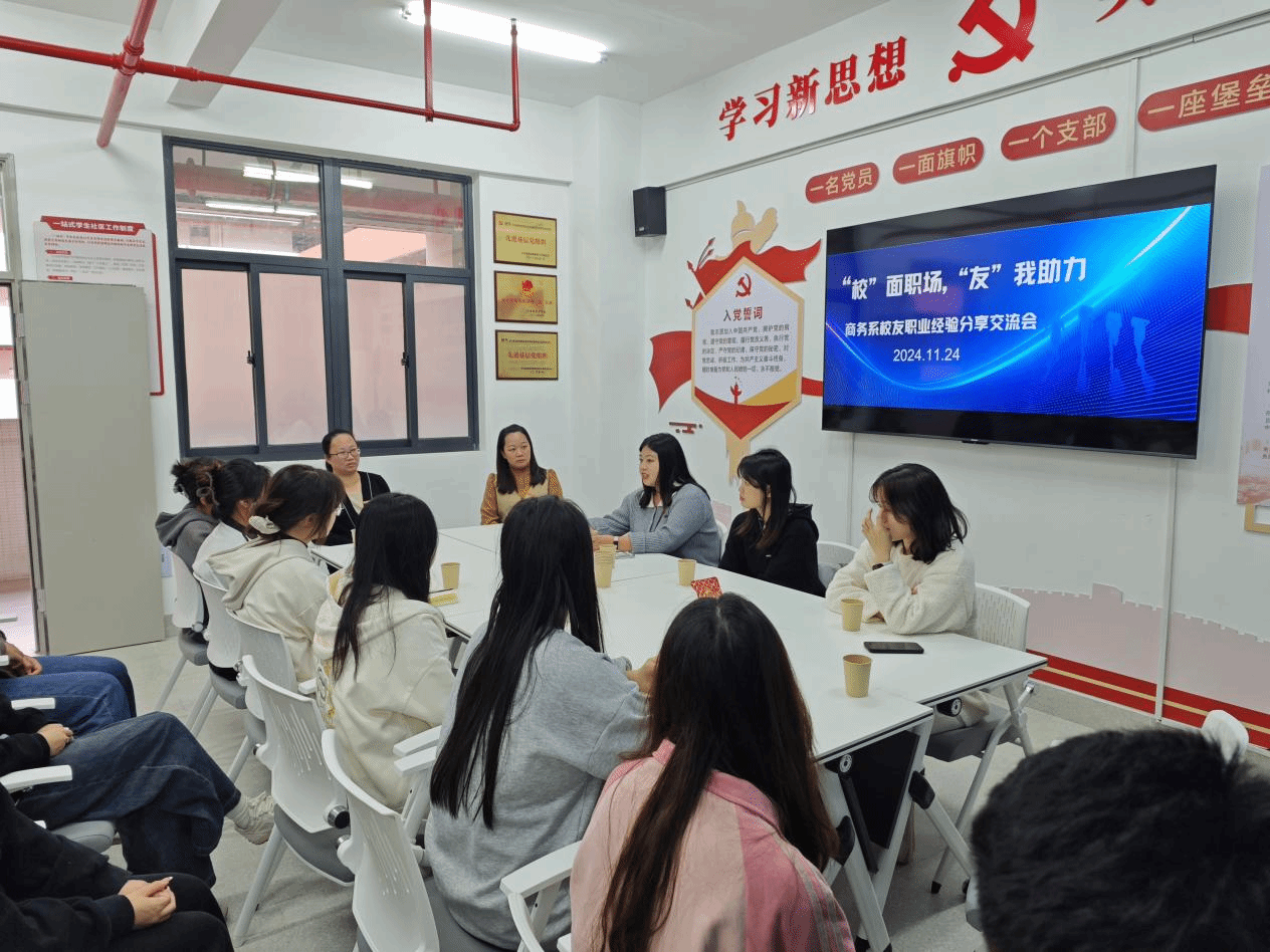 2024年11月24日下午,一场别开生面的校友职业经验交流会在商务系一站式学生社区成功举办。此次交流会旨在通过邀请来自各行各业的优秀校友分享他们的职场经验和人生感悟,为即将步入社会的商务系2025届毕业生提供宝贵的职业指导和建议,同时也为其他年级的在校生提供一个提前了解职场、规划未来的平台,交流会由商务系党总支副书记蔡丹丹主持。